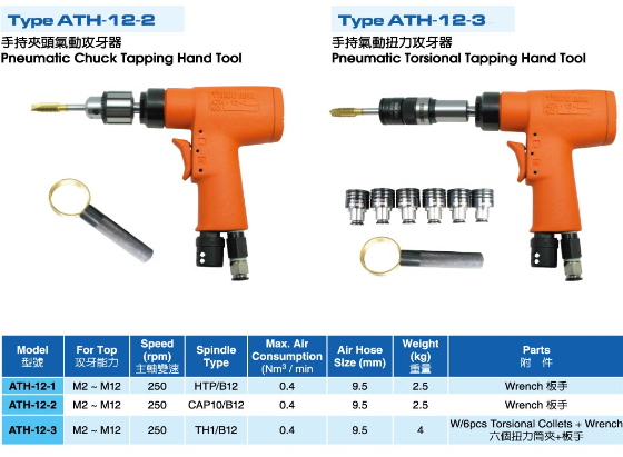 • Product description: Hand-held pneumatic universal tapping: ATH - 12-1 Hand-held pneumatic tapping chuck: ATH - 12-2 Hand-held pneumatic torsion tapping machine: ATH - 12-3 Tap grinder: GT - 516, GT - 1632 The adjusta
