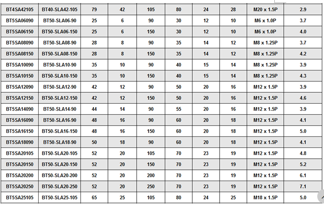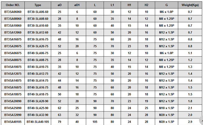 • Product description: BT/SLA SIDE LOCK END MILL HOLDER:BT30→M12 x 1.75P,BT40→M16 x 2.0P,BT50→M24 x 3.0P
